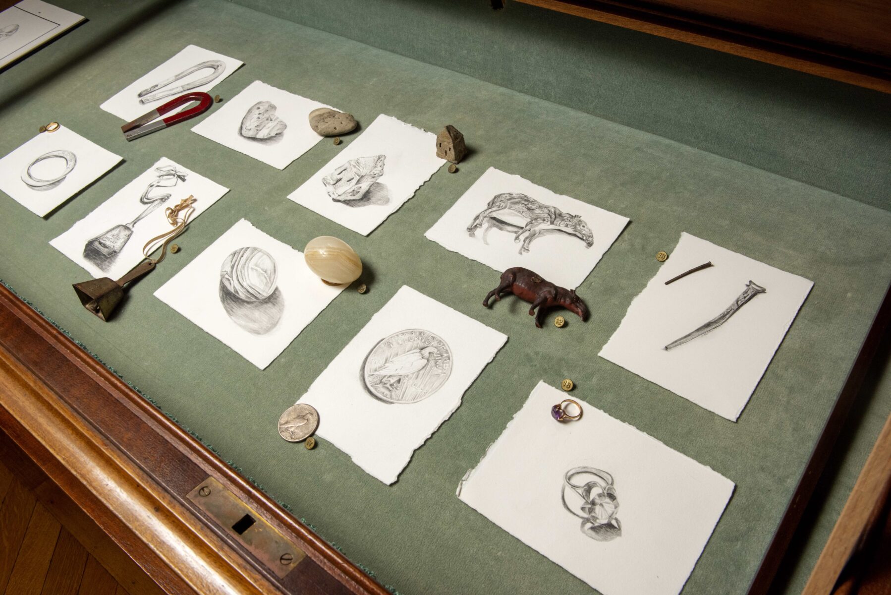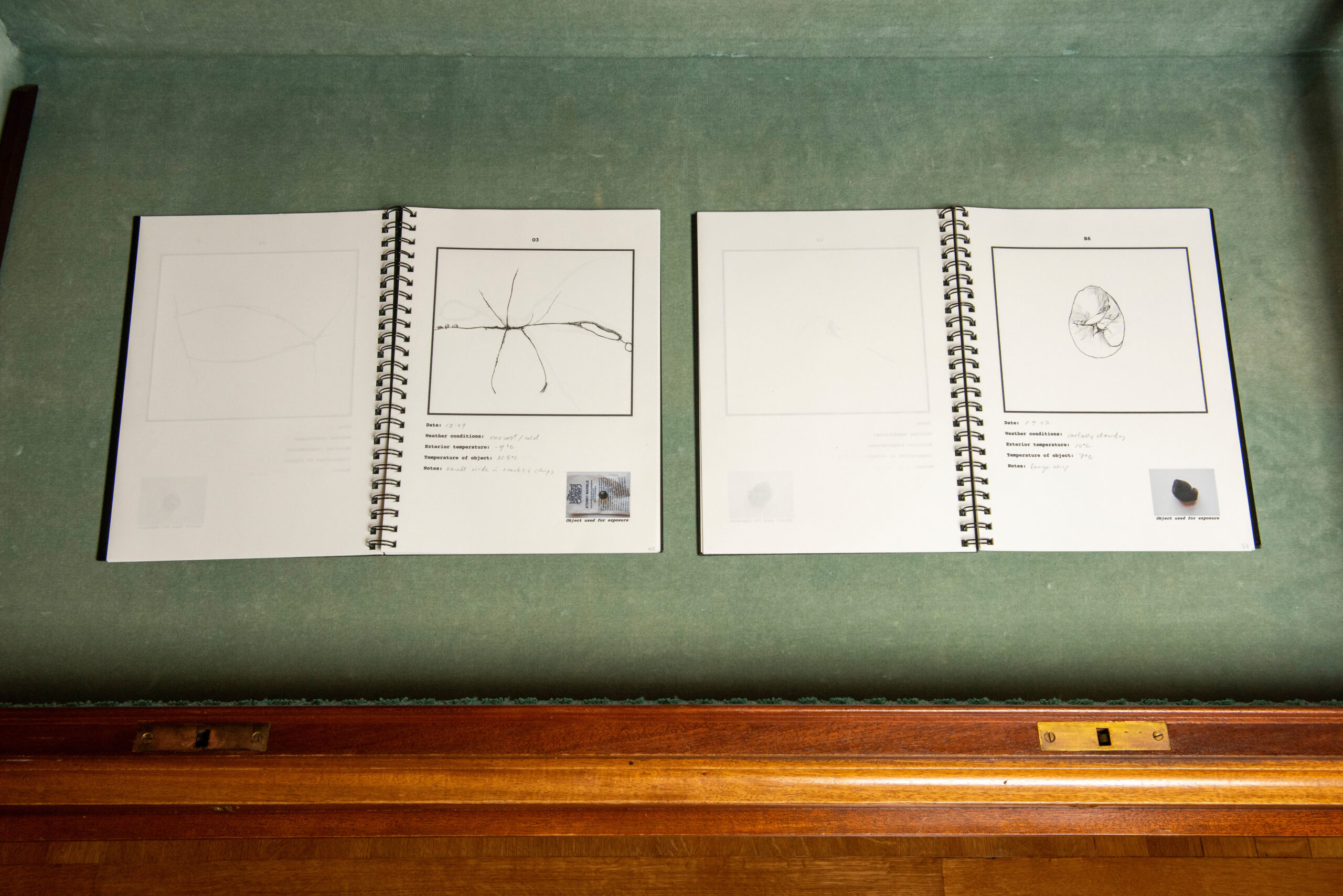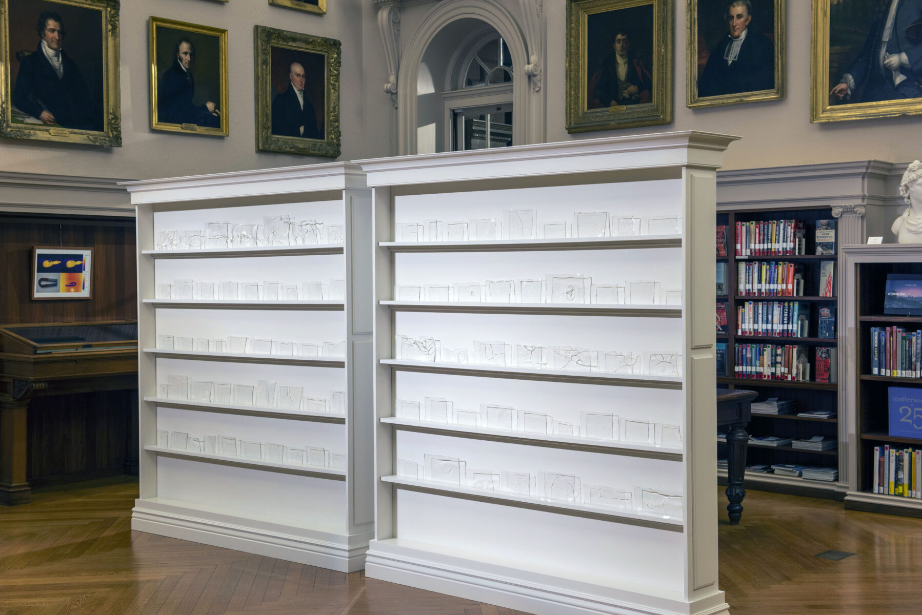 Jocelyne Prince considers the material properties of glass, an amorphous or non-crystalline solid that is the central protagonist of a fantastical library of cracks, drips and scars. Slide Library (2002-present), exhibited in the Redwood’s Rovensky Delivery Room on custom “athenaeum-like” bookcases, features hundreds of intimately scaled, hand-blown glass slides, attesting to what Prince calls her longstanding “love affair with libraries.”